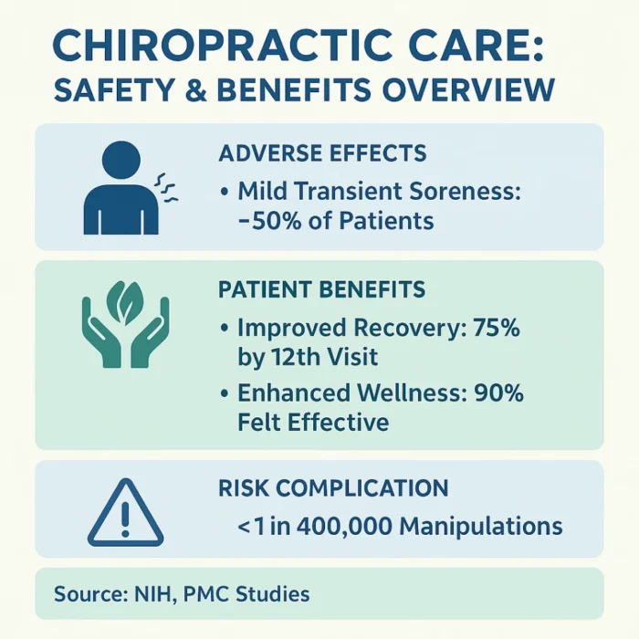 According to the National Institutes of Health (NIH), adverse effects from chiropractic care are uncommon and generally minor. Most patients report temporary soreness, similar to post-workout stiffness, which typically resolves within 24–48 hours.