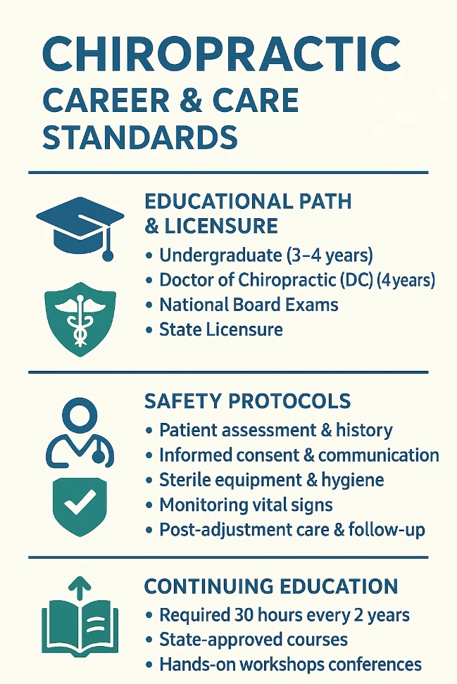 Chiropractors complete a nationally accredited, four-year doctoral program with over 4,000 hours of classroom, lab, and clinical training. Their education is comparable in scope to that of medical doctors (MDs) and osteopathic physicians (DOs). After graduation, chiropractors must pass four national board exams and meet state licensing requirements to practice.